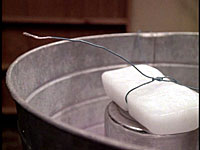Created a time delay fuse for an explosion using lard, newspaper, oven cleaner, and natural gas